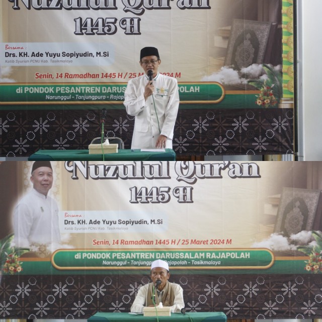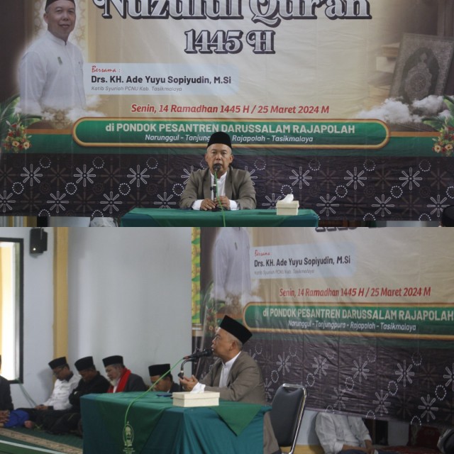 Pondok Pesantren Darussalam rutin melaksanakan pengajian bulanan yang dilaksanakan Pada Senin 25 Maret 2024 M. / 14 Ramdhan 1445 H. Kegiatan ini diikuti oleh Seluruh Santri dan Santriat serta Ibu-ibu Bapak-bapak pengajian. Pengajian bulanan ini diisi oleh Drs. KH. Ade Yuyun Sopiyudin, M.Si. Beliau adalah Katib Syuriah PCNU Kab. Tasikmalaya. Dengan Tema : " Nuzulul Qur'an".