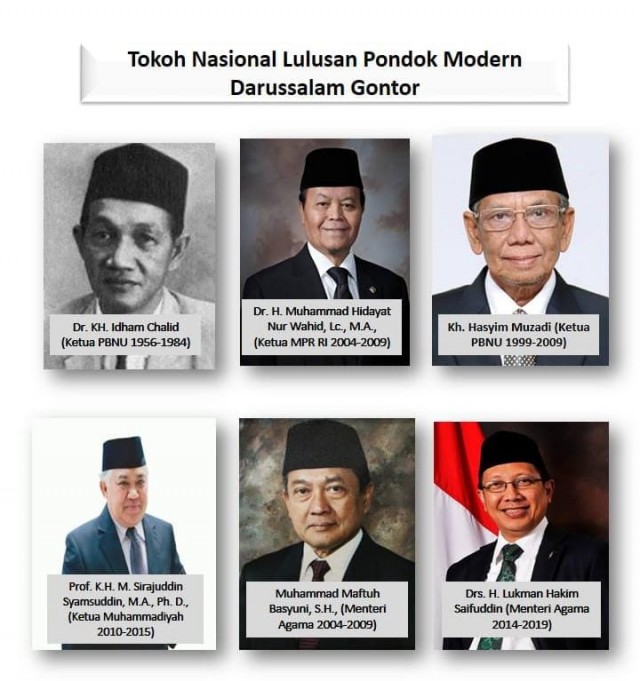 Sementara itu, banyak tokoh nasional yang lahir dari dunia pesantren dan berperan aktif di berbagai bidang, mulai dari keagamaan, sosial, hingga pemerintahan. Di antaranya ialah Dr. KH. Idham Chalid, Dr. H. Muhammad Hidayat Nur Wahid, Lc., M.A., KH. Hasyim Muzadi, Prof. K.H. M. Sirajuddin Syamsuddin, M.A., Ph.D., Muhammad Maftuh Basyuni, S.H., Drs. H. Lukman Hakim Saifuddin, dan yang lainnya. Mereka adalah tokoh-tokoh yang pernah mengenyam pendidikan di Pondok Pesantren, terkhusus Pondok Modern Darussalam Gontor, salah satu pesantren bersejarah yang kini berusia satu abad dan terus memberikan kontribusi besar bagi pendidikan serta pembangunan bangsa.